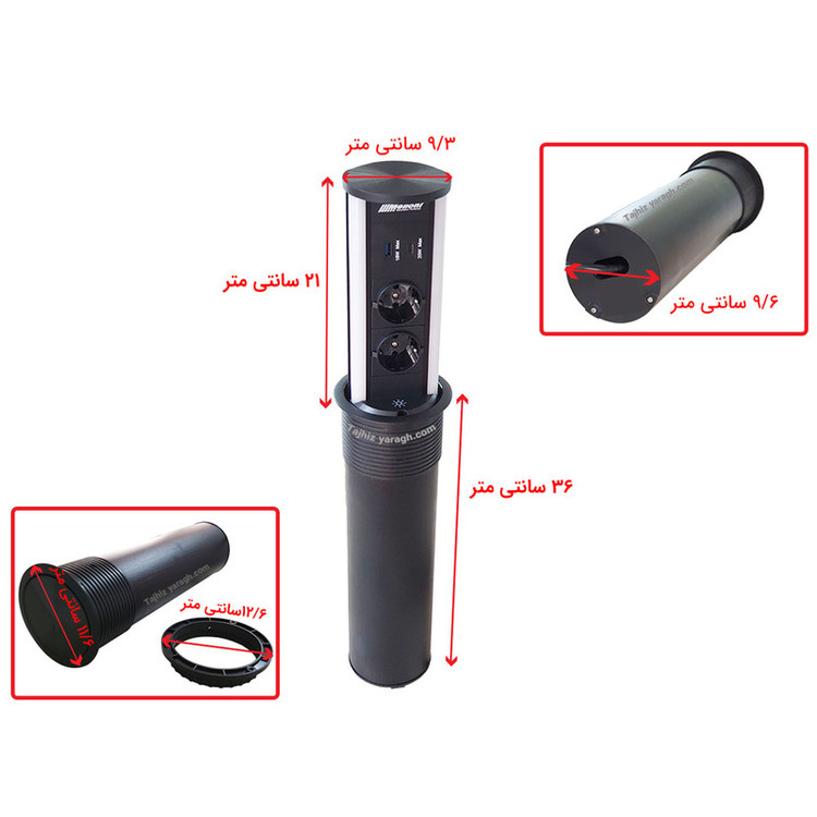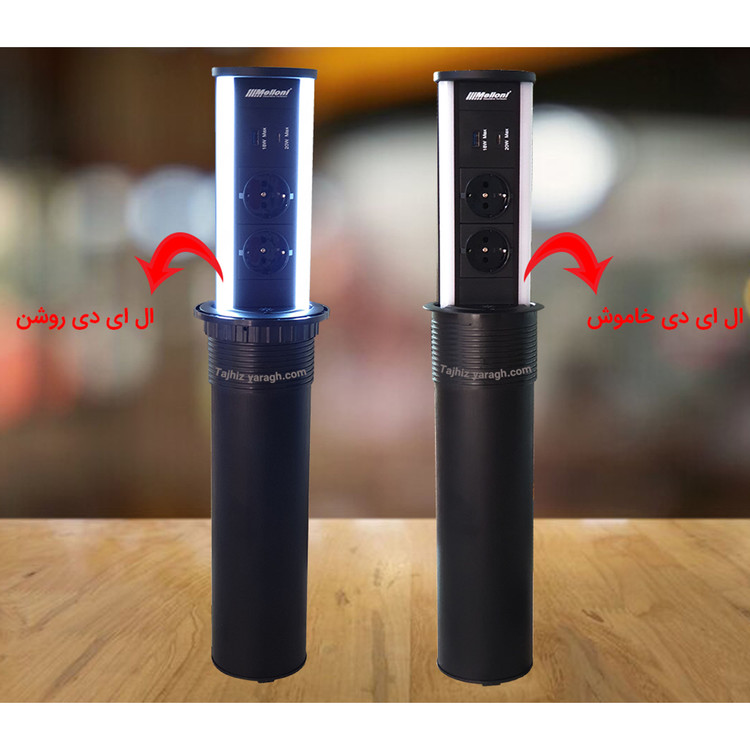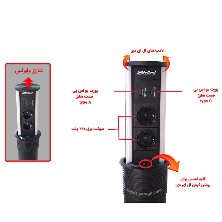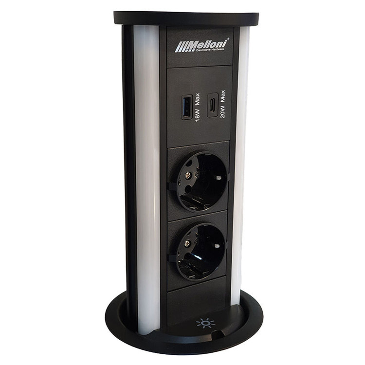 پریز توکار آسانسوری ملونی melloni مدل 10066، مجهز به دو سوکت برق، یک پورت usb type A، یک پورت usb type C، دارای سیم کشی داخلی. مهم ترین ویژگیی که این مدل از پریز های ملونی را از سایر پریزها متمایز می کند، وجود لامپ ال ای دی در کناره های پریز است. این لامپ که با لمسِ کلیدِ تاچِ تعبیه شده در قسمت جلویی پریز روشن و خاموش می شود، به شما امکان می دهد که در تاریکی شب از نور آن برای انجام کارهای شخصی استفاده کنید. این لامپ ها جایگزین بی نظیری برای چراغ مطالعه است. رنگ نور ال ای دی در پریز مشکی، مهتابی(سفید) و در پریز طلایی، آفتابی (زرد) است.