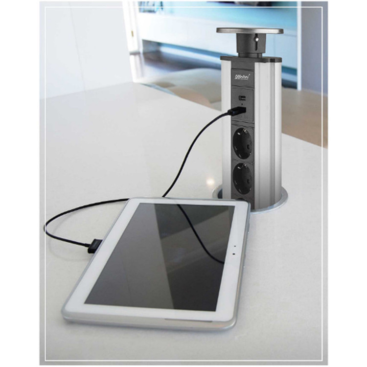 پریز توکار 10008 ملونی دارای 3 پریز و 2 usb میباشد. قابلیت شارژ گوشی های همراه فقط با اتصال به USB جهت نصب این پریز، باید سوراخی به قطر 10 سانتی متر بر روی میز کار یا کانتر آشپزخانه ایجاد شود.