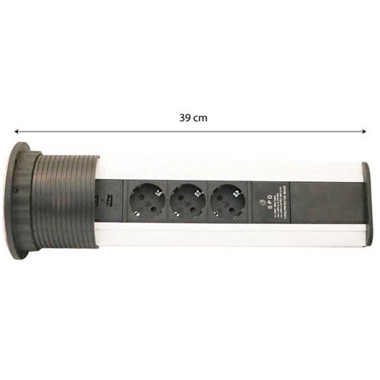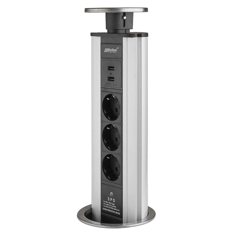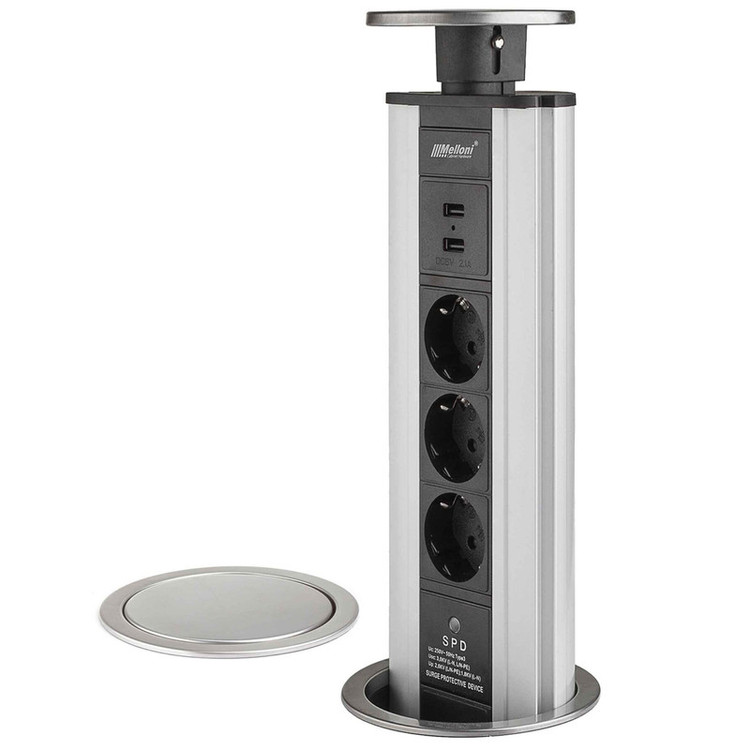 پریز توکار استیل ملونی مدل 10008 دارای سه سوکت برق و دو پورت usb میباشد و با توجه به استوانه ای بودن این پریز سطح بسیار کمی را اشغال خواهد کرد. باز و بسته کردن این مدل پریز به صورت مگنتی بوده به گونه ای که با فشار دست پریز به اندازه 2 تا 3 سانت بالا آمده که از آن به عنوان دستگیره استفاده میشود و کل پریز بالا کشیده میشود و میتوان از آن استفاده شود. این پریز مجهز به محافظ نواسان برق بوده و در زمان نوسانات برق شهری با قطعی ناگهانی برق از وسایل برقی شما محافظت میکند و در ضمن با دارا بودن سیم کشی داخلی به راحتی توسط خود فرد قابلیت نصب را دارد و تنها باید صفحه ای که پریز قرار است در آن محل نصب شود به اندازه ابعاد برش پریز ،برش زده شود.