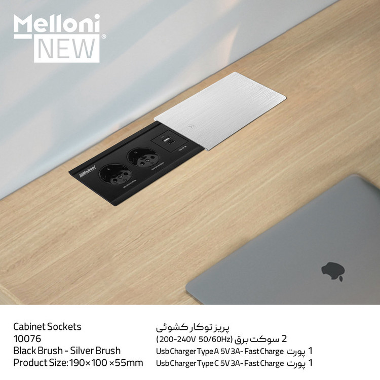 پریز توکار ملونی مدل 10076، دارای دو سوکار برق، یک پورت usb/ یک پورت usb type c/ دارای در کشویی/ پریز توکار یکی از محصولات بسیار کاربردی در زندگی مدرن امروزی است که به معرفی ان میپردازیم با افزایش وسایل برقی در محیط اطراف مشکل دسترسی به پورت های رابط مانند برق به یک دردسر بزرگ در محیط های کار و زندگی افراد بدل شده است از آن جایی که طراحان دکوراسیون داخلی همیشه به دنبال راه کاری برای حذف اجزا اضافی در طراحی چیدمان منزل هستند و در نظر گرفتن تمامی این پورت ها به تعداد کافی عملا امکان پذیر نیست استفاده از پریز های توکار راه حل مناسبی برای حل این مشکل میباشد و کاربرد های فراوانی در میزهای اداری و اشپزخانه دارند
