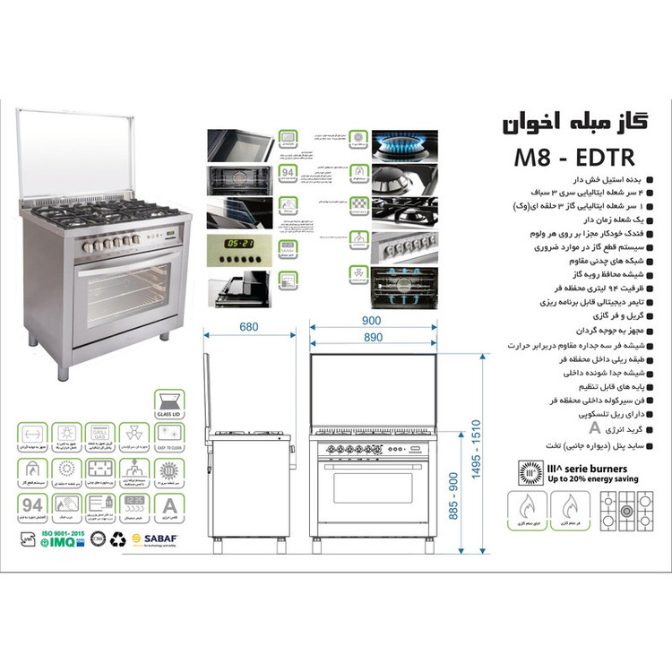 گاز مبله اخوان مدل M8-EDTR از سری گاز های فر دار اخوان می باشد. این گاز فر دار در اندازه ی 90x90x60 سانتیمتر است که دارای 5 شعله و فر با ظرفیت 94 لیتر می باشد. جنس بدنه آن از استیل خشدار و با نمای شیشه تخت است. قطعات اصلی آن اعم از ترموکوپل، فندک و شعله پخش کن ایتالیایی و از برند SABAF میباشند