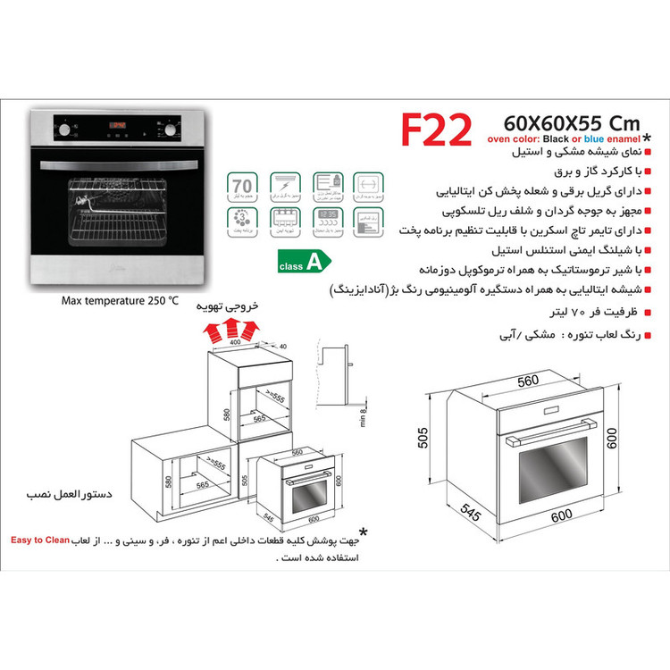 دارای شلف و ریل تلسکوپی دارای فن داکتی جهت یکنواخت کردن حرارت دارای شیلنگ استنلس استیل دارای شیر ترموستاتیک و شیشه ایتالیلیی دارای ترموکوپل دو زمانه