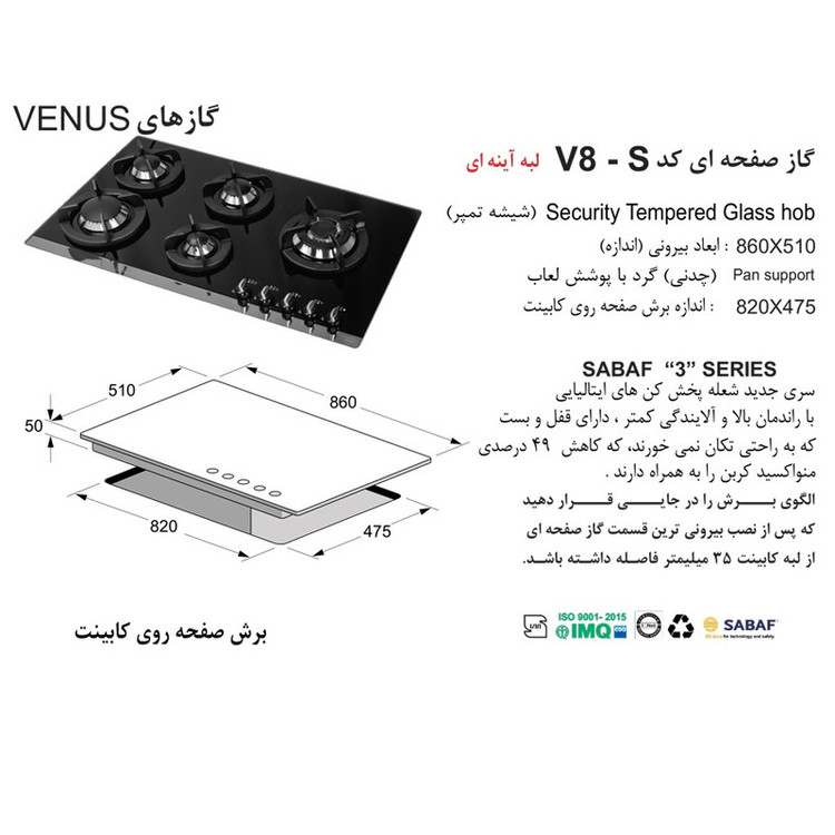 اجاق گاز اخوان مدل V-8-S یکی از پرفروش ترین گازهای شیشه ای پلوپز کنار با قطعات ایتالیایی از سری ونوس اخوان است. نوار استیل جلوه زیبایی خاصی به این گاز بخشیده است. اگر همین گاز با پلوپز وسط بخواهید میتوانید مدل V-8 را انتخاب کنید. گاز اخوان V8S از سری اجاق های سری ونوس شرکت اخوان می باشد که با لبه آینه ای و 5 شعله طراحی شده است. سر شعله های گاز اخوان V8-S ایتالیایی و از سری 3 شرکت ساباف می باشند که با راندمان بالا و آلایندگی کمتر و دارا بودن قفل و بست که به راحتی تکان نمی خورند کاهش 49 درصدی منواکسید کربن را به همراه دارند . این اجاق گاز دارای VOK نیز می باشد و راندمان احتراق آن 25 درصد بالاتر از حد استاندارد می باشد . و جای ولوم ها نیز روی اجاق گاز به صورت تخت می باشد . چدنی های گاز اخوان V8S به صورت گرد و با پوشش لعاب می باشند و اندازه بیرونی این اجاق گاز 86 در 51 سانتی متر میباشد . همچنین اندازه برش روی صفحه کابینت نیز 820 در 475 میلی متر می باشد.