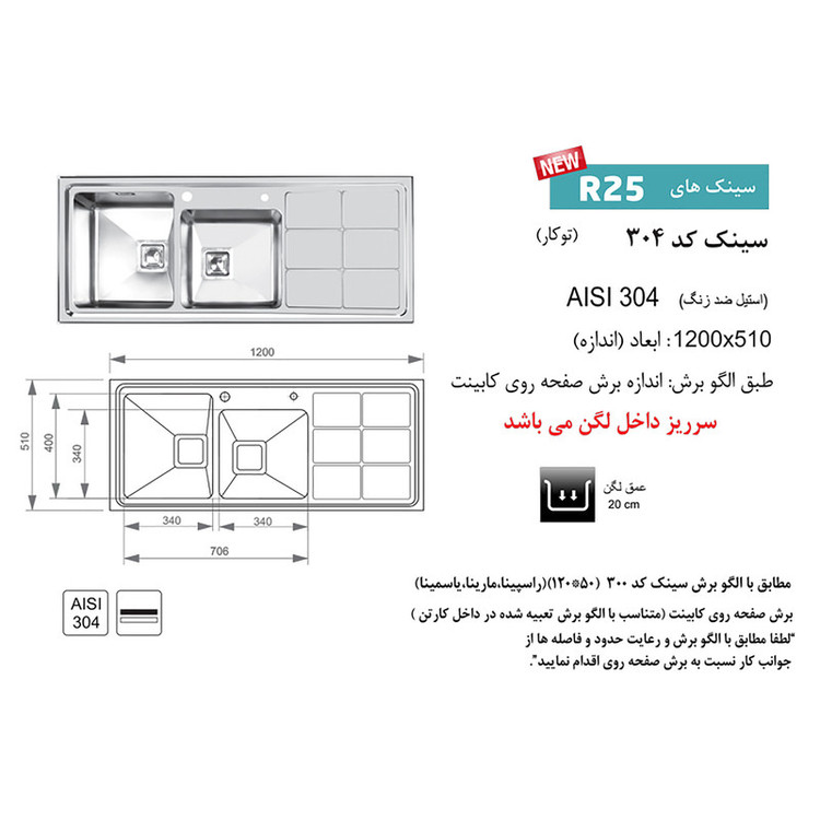 سینک اخوان توکار 304 با ورق ضخیم ایتالیایی این محصول یکی از پر فروش ترین سینک های موجود در بازار ، ورق استفاده شده در این محصول 1 میلیمتری است که دارای جا مایع تخته ، ساطوری شیشه ای و … میباشد. این محصول بدون سرریز در قسمت سینی میباشد